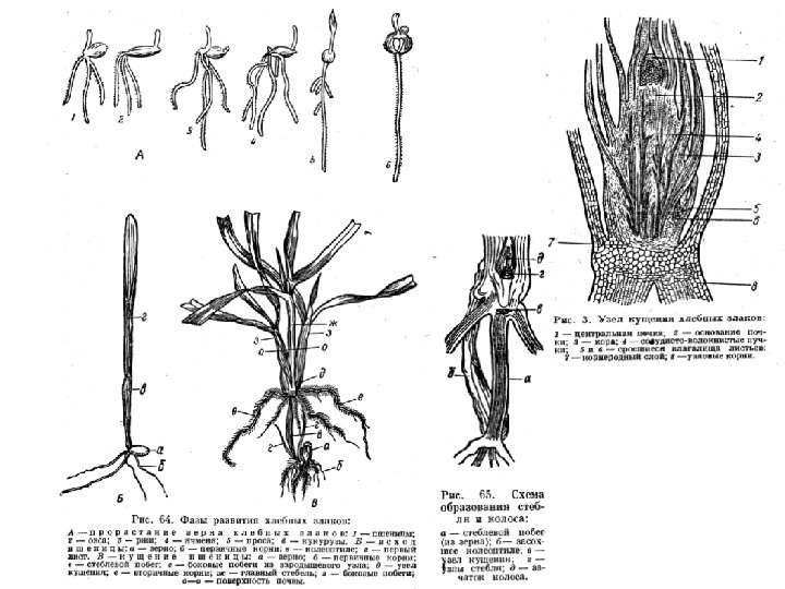 • Хлеба первой группы прорастают, образуя сразу несколько корешков: у озимой пшеницы – 3, у яровой – 5, у овса – 3 -4, у ржи – 4, у ячменя – 5 -8, тогда как хлеба второй группы при прорастании семян, как правило, образуют 1 первичный корешок (у кукурузы, риса, сорго, проса). • У хлебов второй группы, в отличие от хлебов первой группы, эти первичные (зародышевые) корешки не отмирают, а быстро растут и проникают глубоко в почву, создавая основу для дальнейшего развития корневой системы – обычно мочковатой у всех зерновых культур, и в засушливые периоды они в течение продолжительного времени подают воду и минеральные питательные вещества фотосинтезирующим органам. У представителя первой группы – яровой пшеницы зародышевые корни в фазе кущения достигают длины 20 -30 см, в фазе выхода в трубку – 40 -50 см, в фазе колошения – более 100 см. Однако, как правило, из подземных частей стеблевых узлов образуются вторичные (узловые) корни, которые составляют корни основную массу корневой системы этих злаков. Узловые корни у зерновых культур появляются через 12 -18 дней после всходов, но при пересыхании верхнего слоя почвы растут слабо и даже не могут развиться совсем. • При развитии яровой пшеницы только с первичной (зародышевой) корневой системой урожайность снижается на 30 -35% по сравнению с урожайностью с хорошо развитой корневой системой. В целом, как зародышевые (первичные), так и узловые (вторичные) корни имеют большое значение для роста и развития растений.