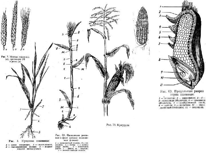 Зерновые злаки 1 -й группы – относятся к сем. Poaceae, сюда входят пшеница, рожь, ячмень, овес, тритикале. ▪▪ Растениям этой группы характерны признаки: соцветие – колос (только у овса метелка); плод – зерновка с продолговатой бороздкой; зерновка прорастает несколькими (3 -5 и более) зародышевыми корешками; корневая система – мочковатая; стебель – соломина, обычно полая. Взрослые растения имеют озимые и яровые формы, в целом они менее требовательны к теплу, но более требовательны к влаге и относятся к растениям длинного дня. Зерновые злаки 2 -й группы – тоже относятся к сем. Poaceae, в эту группу входят рис, просо, сорго, кукуруза. ▪▪ Отличительные особенности этой группы растений: соцветие – метелка (у кукурузы мужское соцветие – метелка, женское – початок); плод – зерновка, на которой бороздка отсутствует; зерно прорастает только одним зародышевым корешком; корневая система – мочковатая; стебель – соломина с выполненной сердцевиной. Взрослые растения имеют лишь одни яровые формы, они более требовательны к теплу и свету, засухоустойчивостью (кроме риса) и относятся к растениям короткого дня.