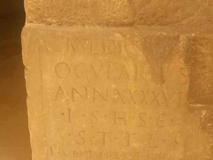 Надпись на классической латыни Hunc unum plurimi consentiunt Romae bonorum optimum fuisse virum Lucium Scipionem. Filius Barbati, Consul, Censor, Aedilis hic fuit. Hic cepit Corsicam Aleriamque urbemdedit tempestatibus aedem merito.