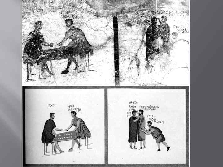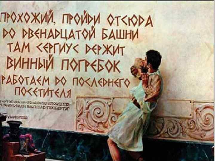 Помпейские надписи Отражают состояние разговорного языка в классический период развития. Pecunia non olet (Деньги не пахнут) Oppi, emboliari, furuncule (Оппий – клоун, вор, воришка) Luci Istacidi, at quem non ceno, barbarus ille mihi est (Люций Истацидий, с которым я есть не сяду, для меня – варвар)