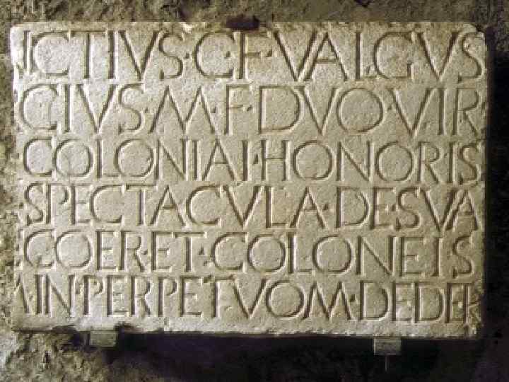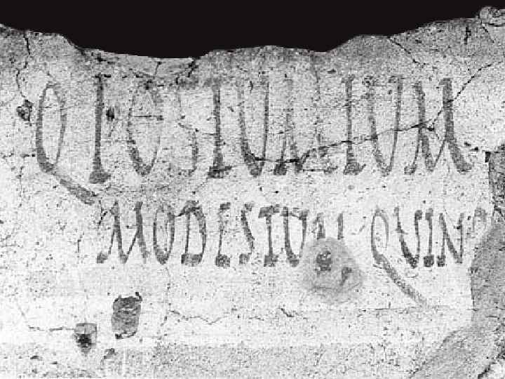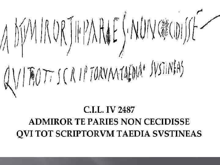 Помпейские надписи Virum vendere nolo meom (Мужа своего продавать не хочу) Quisquis ama, valia (Да здравствует тот, кто любит) Secundinus mulomedicus fecit sibi domum eterna (Ветеринар Секундин сделал себе вечный дом) – поздний период