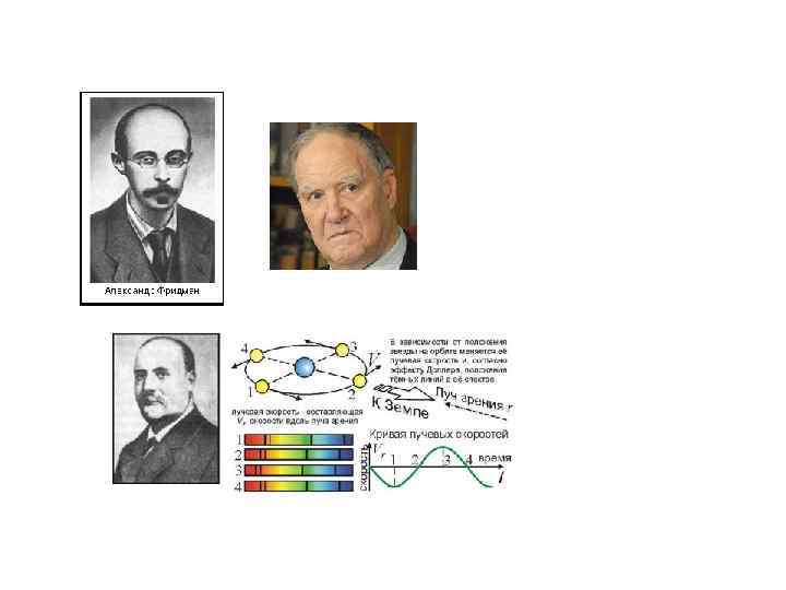 Теория большого взрыва Возможность расширения Вселенной была предсказана теоретически как одно из следствий применения к решению космологических проблем общей теории относительности. Первые труды в этой области принадлежат талантливому советскому математику Александровичу Фридману (1888— 1925). Он широко известен как геофизик-метеоролог, специалист по прикладным вопросам динамики атмосферы. Но много времени Фридман отдал математическому анализу решений космологических уравнений Эйнштейна. Незадолго до смерти Фридман получил серию решений уравнений Эйнштейна. Выходило, что расширение может явиться одним из основных общих свойств Вселенной — важнейшим атрибутом ее эволюции. Работы русского ученого поначалу не привлекли к себе должного внимания. Они были оценены по достоинству лишь в связи с открытием Э. Хабблом красного смещения и развитием современных представлений о первоначально горячей Вселенной и Большом Взрыве. В 1927 году Ж. Леметр, студент из Эддингтона, независимо от Фридмана выдвинул свою идею возникновения Вселенной и ее дальнейшего расширения из точки. Ей дали на некоторое время название «атома-отца» . Сам Леметр категорически был против подобного образа и вообще теологической трактовки своей теории. Процесс возникновения Вселенной Леметр представил в форме Большого Взрыва. Молодой ученый первым попытался найти и вероятные следы начального Взрыва. Леметр допускал, что таким отголоском могли быть космические лучи. Его гипотезу астрономы заметили лишь после выступления в 1933 году, когда Леметр выдвинул новый вариант концепции расширения Вселенной — из плотного сгустка материи конечных, но очень малых размеров. Задача формирования более конкретной, физически разработанной эволюционной космологокосмогонической модели расширяющейся Вселенной была решена в основном американским физиком Гамовым, русским по происхождению. Джордж (Георгий Антонович) Гамов (1904— 1968) впервые предложил в 1946 году теорию, получившую затем наименование «теории Большого Взрыва» (а точнее — «Большого Удара» ). Согласно ей, вся современная наблюдаемая Вселенная представляет собой результат катастрофически быстрого разлета материи, находившейся до того в сверхплотном состоянии, недоступном для описания в рамках современной физики. Удаление галактик подчиняется необычным математическим закономерностям. Оно происходит с различными скоростями. Чем больше расстояние между галактиками, тем выше оказывается скорость их взаимного удаления.