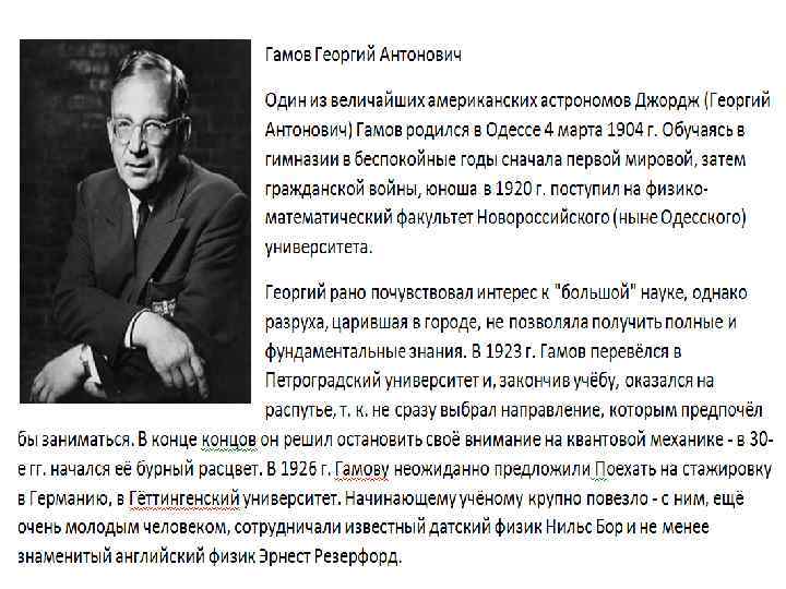 Гамов Георгий Антонович Один из величайших американских астрономов Джордж (Георгий Антонович) Гамов родился в Одессе 4 марта 1904 г. Обучаясь в гимназии в беспокойные годы сначала первой мировой, затем гражданской войны, юноша в 1920 г. поступил на физико-математический факультет Новороссийского (ныне Одесского) университета. Георгий рано почувствовал интерес к "большой" науке, однако разруха, царившая в городе, не позволяла получить полные и фундаментальные знания. В 1923 г. Гамов перевёлся в Петроградский университет и, закончив учёбу, оказался на распутье, т. к. не сразу выбрал направление, которым предпочёл бы заниматься. В конце концов он решил остановить своё внимание на квантовой механике - в 30 -е гг. начался её бурный расцвет. В 1926 г. Гамову неожиданно предложили Поехать на стажировку в Германию, в Гёттингенский университет. Начинающему учёному крупно повезло - с ним, ещё очень молодым человеком, сотрудничали известный датский физик Нильс Бор и не менее знаменитый английский физик Эрнест Резерфорд.