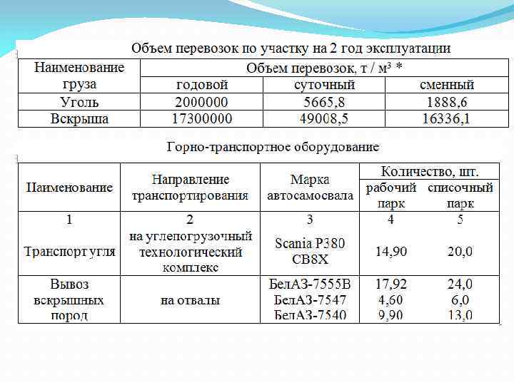 Карьерный транспорт В качестве автотранспорта на перевозках вскрышных пород используется автосамосвалы Бел. АЗ-7555 В (г/п 55 т), Бел. АЗ 7547 (г/п 45 т) и Бел. АЗ-7540 (г/п 30 т), которые работают в комплекте с экскаваторами ЭКГ-5 А емкостью ковша 5 м 3, РС-750 и РС-1250 с емкостью ковша 3, 4 и 7 м 3 соответственно. Для доставки угля из забоев на углепогрузочный комплекс используется автосамосвалы Scania. P 380 CB 8 X (г/п 30 т). В комплекте с этими самосвалами работают экскаваторы типа обратная лопата - марки РС 400. CAT-DL 330 и ZX-240 с ковшом емкостью 2. 2; 2, 2 и 1, 0 м 3 соответственно.