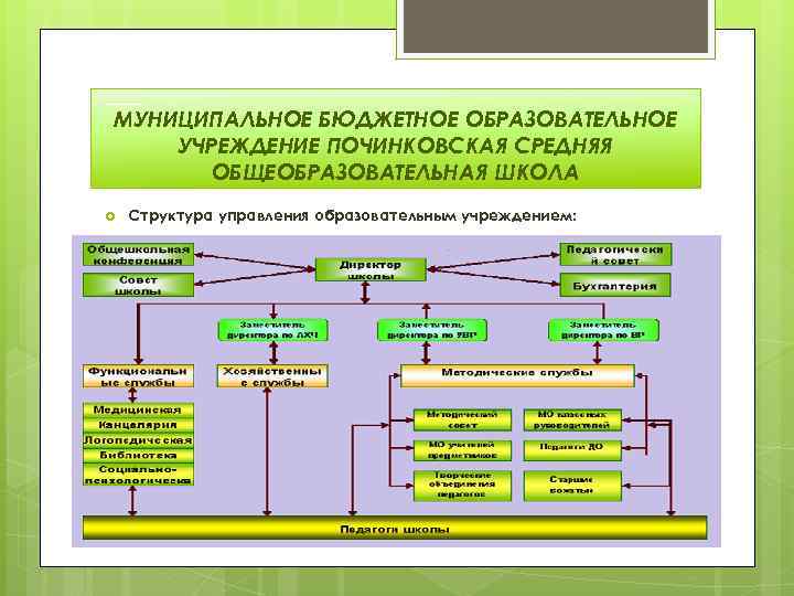 МУНИЦИПАЛЬНОЕ БЮДЖЕТНОЕ ОБРАЗОВАТЕЛЬНОЕ УЧРЕЖДЕНИЕ ПОЧИНКОВСКАЯ СРЕДНЯЯ ОБЩЕОБРАЗОВАТЕЛЬНАЯ ШКОЛА Структура управления образовательным учреждением: