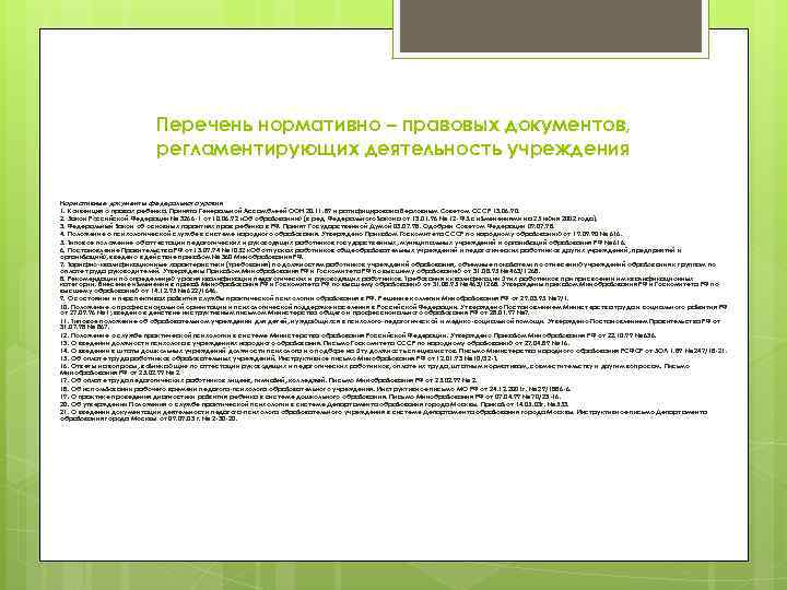 Перечень нормативно – правовых документов, регламентирующих деятельность учреждения Нормативные документы федерального уровня 1. Конвенция о правах ребенка. Принята Генеральной Ассамблеей ООН 20. 11. 89 и ратифицирована Верховным Советом СССР 13. 06. 90. 2. Закон Российской Федерации № 3266 -1 от 10. 06. 92 «Об образовании» (в ред. Федерального закона от 13. 01. 96 № 12 - ФЗ. с изменениями на 25 июня 2002 года). 3. Федеральный закон об основных гарантиях прав ребенка в РФ. Принят Государственной Думой 03. 07. 98. Одобрен Советом Федерации 09. 07. 98. 4. Положение о психологической службе в системе народного образования. Утверждено Приказом Госкомитета СССР по народному образованию от 19. 09. 90 № 616. 5. Типовое положение об аттестации педагогических и руководящих работников государственных, муниципальных учреждений и организаций образования РФ № 616. 6. Постановление Правительства РФ от 13. 09. 94 № 1052 «Об отпусках работников общеобразовательных учреждений и педагогических работников других учреждений, предприятий и организаций» , введено в действие приказом № 360 Минобразования РФ. 7. Тарифно-квалификационные характеристики (требования) по должностям работников учреждений образования, объемные показатели по отнесению учреждений образования к группам по оплате труда руководителей. Утверждены Приказом Минобразования РФ и Госкомитета РФ по высшему образованию от 31. 08. 95 № 463/1268. 8. Рекомендации по определению уровня квалификации педагогических и руководящих работников. Требования к квалификации этих работников присвоении им квалификационных категорий. Внесение изменений в приказ Минобразования РФ и Госкомитета РФ по высшему образованию от 31. 08. 95 № 463/1268. Утверждены приказом Минобразования РФ и Госкомитета РФ по высшему образованию от 14. 12. 95 № 622/1646. 9. О состоянии и перспективах развития службы практической психологии образования в РФ. Решение коллегии Минобразования РФ от 29. 03. 95 № 7/1. 10. Положение о профессиональной ориентации и психологической поддержке населения в Российской Федерации. Утверждено Постановлением Министерства труда и социального развития РФ от 27. 09. 96 № 1; введено в действие инструктивным письмом Министерства общего и профессионального образования РФ от 28. 01. 97 № 7. 11. Типовое положение об образовательном учреждении для детей, нуждающихся в психолого-педагогической и медико-социальной помощи. Утверждено Постановлением Правительства РФ от 31. 07. 98 № 867. 12. Положение о службе практической психологии в системе Министерства образования Российской Федерации. Утверждено Приказом Минобразования РФ от 22. 10. 99 № 636. 13. О введении должности психолога в учреждениях народного образования. Письмо Госкомитета СССР по народному образованию от 27. 04. 89 № 16. 14. О введении в штаты дошкольных учреждений должности психолога и о подборе на эту должность специалистов. Письмо Министерства народного образования РСФСР от ЗОЛ 1. 89 № 247/18 -21. 15. Об оплате труда работников образовательных учреждений. Инструктивное письмо Минобразования РФ от 12. 01. 93 № 10/32 -Т. 16. Ответы на вопросы, возникающие по аттестации руководящих и педагогических работников, оплате их труда, штатным нормативам, совместительству и другим вопросам. Письмо Минобразования РФ от 25. 02. 99 № 2. 17. Об оплате труда педагогических работников лицеев, гимназий, колледжей. Письмо Минобразования РФ от 25. 02. 99 № 2. 18. Об использ