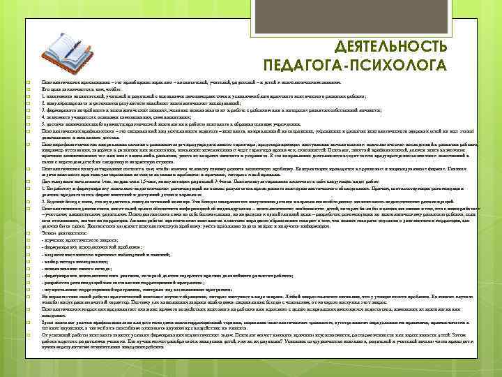 ДЕЯТЕЛЬНОСТЬ ПЕДАГОГА-ПСИХОЛОГА q q q q q q q Психологическое просвещение – это приобщение взрослых – воспитателей, учителей, родителей – и детей к психологическим знаниям. Его цель заключается в том, чтобы: 1. ознакомить воспитателей, учителей и родителей с основными закономерностями и условиями благоприятного психического развития ребенка; 2. популяризировать и разъяснять результаты новейших психологических исследований; 3. формировать потребность в психологических знаниях, желание использовать их в работе с ребенком или в интересах развития собственной личности; 4. знакомить учащихся с основами самопознания, самовоспитания; 5. достичь понимания необходимости практической психологии и работы психолога в образовательном учреждении. Психологическая профилактика – это специальный вид деятельности педагога – психолога, направленный на сохранение, укрепление и развитие психологического здоровья детей на всех этапах дошкольного и школьного детства. Психопрофилактическое направление связано с решением задач предупредительного характера, предотвращающих наступление нежелательных психологических последствий в развитии ребенка, например отставания, задержек в развитии или воспитании, появление нежелательных черт характера привычек, склонностей. Психолог, занятый профилактикой, должен знать возможные причины возникновения тех или иных аномалий в развитии, уметь их вовремя заметить и устранить. В это направление деятельности входит также предупреждение возможных осложнений в связи с переходом детей на следующую возрастную ступень. Психологическое консультирование состоит в том, чтобы помочь человеку самому решить возникшую проблему. Консультация проводится в групповых и индивидуальных формах. Главная задача психолога при консультировании выявить истинные проблемы и причины, которые к ней привели. Для младшего школьника 1 час, подростков 1, 5 часа, консультация родителей 3 -4 часа. Психоконсультирование включает в себя следующие виды работ: 1. Выработку и формулировку психолого-педагогических рекомендаций на основе результатов проведенного психодиагностического обследования. Причем, соответствующие рекомендации должны предлагаться в форме понятной и доступной детям и взрослым. 2. Ведение бесед с теми, кто нуждается в консультативной помощи. Эти беседы завершаются получением детьми и взрослыми необходимых им психолого-педагогических рекомендаций. Психологическая диагностика имеет своей целью обеспечить информацией об индивидуально – психологических особенностях детей, которая была бы полезна им самим и тем, кто с ними работает – учителям, воспитателям, родителям. Психодиагностика сама по себе бессмысленна, но подведена к одной главной цели – разработке рекомендации по психологическому развитию ребенка, если есть отклонения, значит по коррекции. Анализ работы практических психологов в системе народного образования говорит о том, что нельзя говорить отдельно о диагностике и коррекции, все должно быть едино. Диагностика выделяет психологическую проблему: уметь правильно задать вопрос и получить информацию. Этапы диагностики: - изучение практического запроса; - формулировка психологической проблемы; - выдвижение гипотез о причинах наблюдений и явлений; - выбор метода исследования; - использование са