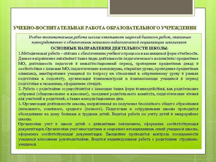УЧЕБНО-ВОСПИТАТЕЛЬНАЯ РАБОТА ОБРАЗОВАТЕЛЬНОГО УЧРЕЖДЕНИЯ Учебно-воспитательная работа школы охватывает широкий диапазон работ, связанных непосредственно с обеспечением психолого-педагогической социализации школьников. ОСНОВНЫЕ НАПРАВЛЕНИЯ ДЕЯТЕЛЬНОСТИ ШКОЛЫ: 1. Методическая работа – связана с обеспечением учебного процесса и касающихся форм отчетности. Данное направление охватывает такие виды деятельности педагогического коллектива: предметные МО, деятельность педагогов в межаттестационный период, проведение предметных декад в соответствии с планами МО, педагогические консилиумы, открытые уроки, проведение предметных олимпиад, анкетирование учащихся по вопросу их отношения к современному уроку в рамках подготовки к педсовету, организация взаимоконтроля и взаимопомощи учащихся в период подготовки к экзаменам, оформление стендов. 2. Работа с родителями осуществляется с помощью таких форм взаимодействия, как родительские собрания (общешкольные и классные), заседания родительского комитета, педагогические чтения для учителей и родителей, а также консультационные дни. 3. Организация деятельности школы, направленная на получение бесплатного общего образования (начального, основного, среднего (полного). Педагогами и сотрудниками школы проводится обследование на дому больных и трудных детей. Ведется работа по учету детей в микрорайоне школы. Организован учет в школе детей с девиантным поведением, оформлена соответствующая документация. Организован учет многодетных и социально незащищенных семей учащихся школы, оформлена соответствующая документация. Ежедневно проводится контроль посещаемости учащихся классными руководителями. Ведется индивидуальная работа с родителями «трудных» учащихся.
