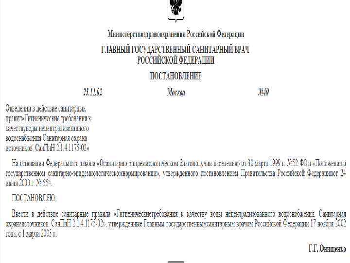 Изучение Сан. Пи. На 2. 1. 41175. 02 Питьевая вода. (Сан. Пи. Н. Государственное санитарно-эпидемиологическое нормирование является одной из основных функций Государственной санитарно-эпидемиологической службы РФ и направлено на разработку научно обоснованных критериев обеспечения санитарноэпидемиологического благополучия населения, безопасности и безвредности среды обитания человека для его здоровья. Основной задачей государственного санитарно-эпидемиологического нормирования является установление санитарно-эпидемиологических требований, обеспечивающих безопасность для здоровья человека среды его обитания. Нормативными правовыми актами, устанавливающими санитарно-эпидемиологические требования, являются государственные санитарно-эпидемиологические правила (санитарные правила, санитарные правила и нормы, санитарные нормы, гигиенические нормативы), содержащие: -гигиенические и противоэпидемические требования по обеспечению санитарно-эпидемиологического благополучия населения, профилактики заболеваний человека, благоприятных условий его проживания, труда, быта, отдыха, обучения и питания, а также сохранению и укреплению его здоровья; -оптимальные и предельно допустимые уровни влияния на организм человека факторов среды его обитания; -максимально или минимально допустимое количественное и (или) качественное значение показателя, характеризующего с позиций безопасности и (или) безвредности для здоровья человека тот или иной фактор среды его обитания.