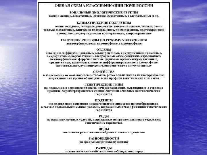 КЛАССИФИКАЦИЯ ПОЧВ СССР (1977) ЗОНАЛЬНЫЕ ЭКОЛОГИЧЕСКИЕ ГРУППЫ. (таежно-лесные, лесостепные, сухостепные, полупустынные и др. ) КЛИМАТИЧЕСКИЕ ПОДГРУППЫ (очень холодные, умеренные, умеренно теплые, очень теплые) БИО-ФИЗИКО-ХИМИЧЕСКИЕ ГРУППЫ (по составу гумуса, реакции почв, карбонатности солонцеватости, засолению и др. ) ГЕНЕТИЧЕСКИЕ РЯДЫ ПО РЕЖИМУ УВЛАЖНЕНИЯ (автоморфные, полугидроморфные, гидроморфные) ГЕНЕТИЧЕСКИЕ ТИПЫ (по единству биологических, климатических, гидрологических условии и проявлению основного процесса почвообразования) ПОДТИПЫ (по проявлению основного и налагающегося процессов почвовобразования в связи с подзональной и фациальной сменой условий) РОДЫ (по влиянию местных условий) ВИДЫ (но степени развития почвообразовательных процессов) РАЗНОВИДНОСТИ (по гранулометрическому составу) РАЗРЯДЫ (по генетическим свойствам почвообразующих пород)