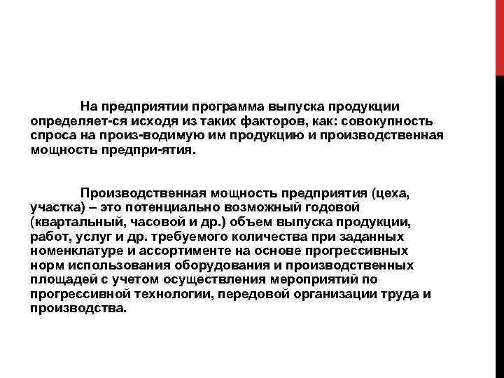 На предприятии программа выпуска продукции определяет ся исходя из таких факторов, как: совокупность спроса на произ водимую им продукцию и производственная мощность предпри ятия. Производственная мощность предприятия (цеха, участка) – это потенциально возможный годовой (квартальный, часовой и др. ) объем выпуска продукции, работ, услуг и др. требуемого количества при заданных номенклатуре и ассортименте на основе прогрессивных норм использования оборудования и производственных площадей с учетом осуществления мероприятий по прогрессивной технологии, передовой организации труда и производства.