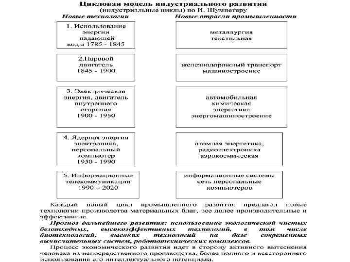 • Каждый новый цикл промышленного развития предлагал новые технологии производства материальных благ, все долее производительные и эффективные. • Прогноз дальнейшего развития: использование экологической чистых безотходных, высокоэффективных технологий, в том числе биотехнологий, высоких технологий на базе современных вычислительных систем, робототехнических комплексов. • Процесс экономического развития идет в сторону активного вытеснения человека из непосредственного производства, более полного и всестороннего использования его интеллектуального потенциала.