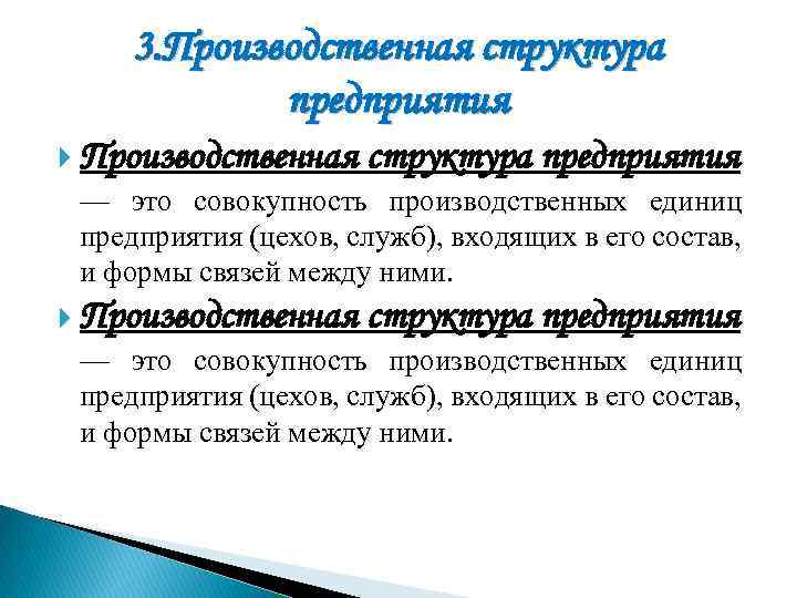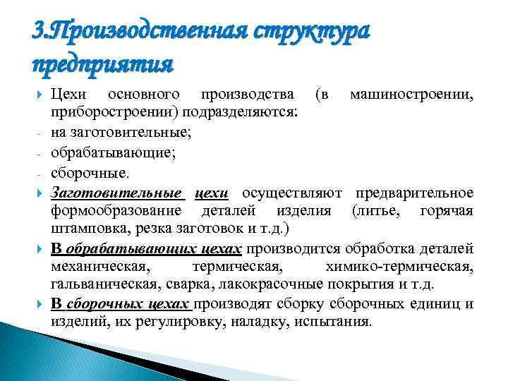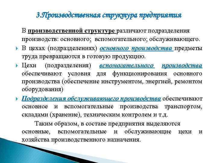 3. Производственная структура предприятия — это совокупность производственных единиц предприятия (цехов, служб), входящих в его состав, и формы связей между ними.