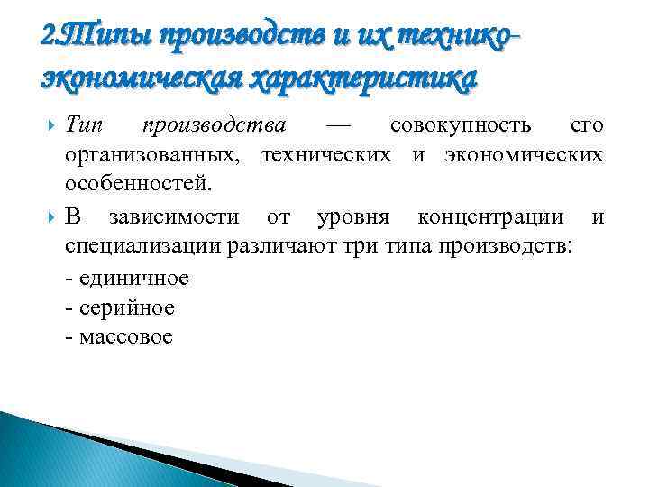 2. Типы производств и их технико- экономическая характеристика Тип производства — совокупность его организованных, технических и экономических особенностей. В зависимости от уровня концентрации и специализации различают три типа производств: - единичное - серийное - массовое