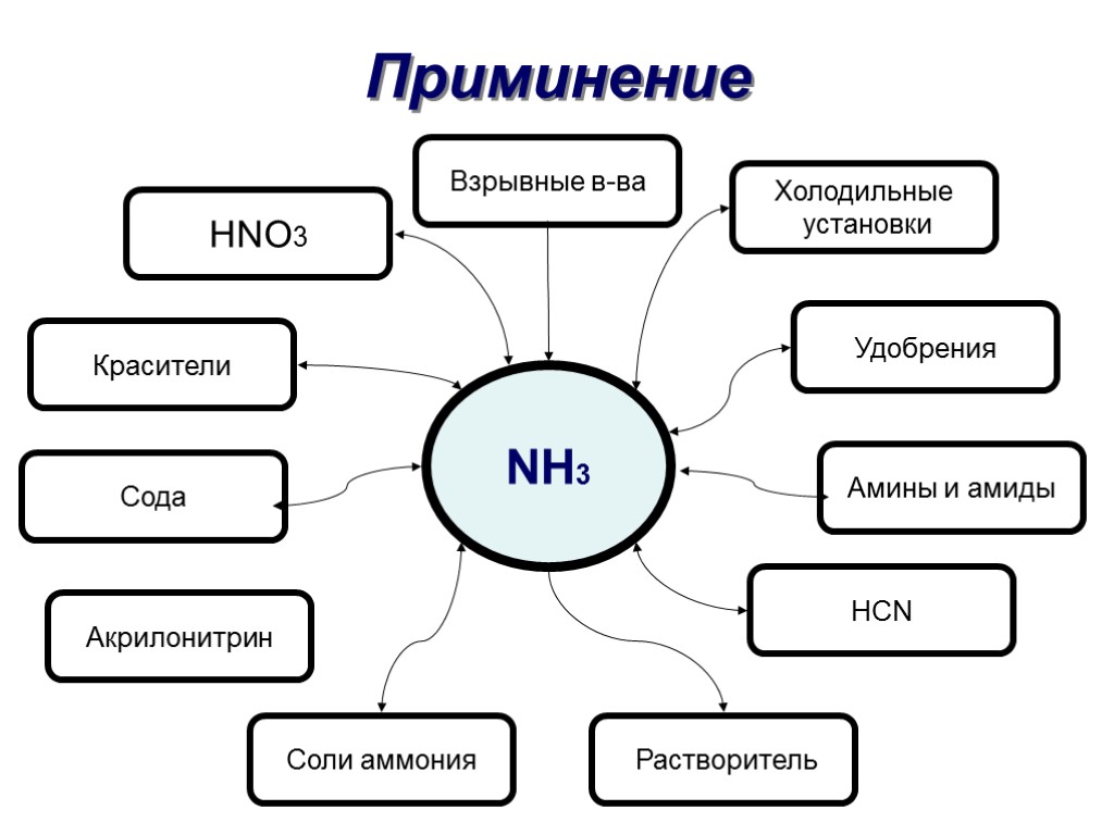 Приминение HNO3 Взрывные в-ва Красители Сода Акрилонитрин Соли аммония Растворитель HCN Амины и амиды Удобрения Холодильные установки NH3