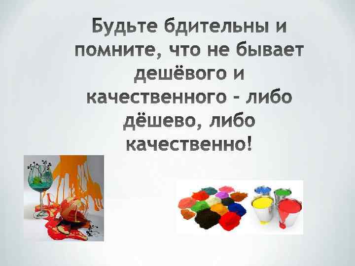 - цвет - массовая доля нелетучих веществ - время высыхания - срок службы покрытия - укрывистость - светостойкость - стойкость к атмосферным воздействиям - стойкость к влажной уборке и др.
