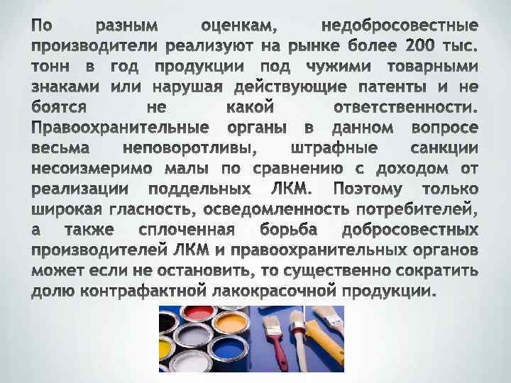 Производство лакокрасочных материалов (ЛКМ) – сложный научно-производственный процесс. Разработка рецептуры, подбор сырьевых компонентов, тестирование готового продукта, испытания и приёмка каждой выпущенной партии – неотъемлемые этапы производства. Потребитель, не всегда может быть уверен, что выбранный им производитель ЛКМ отвечает заданным требованиям и не предлагает подделку.