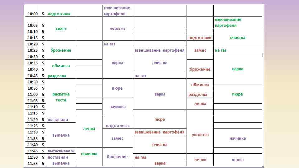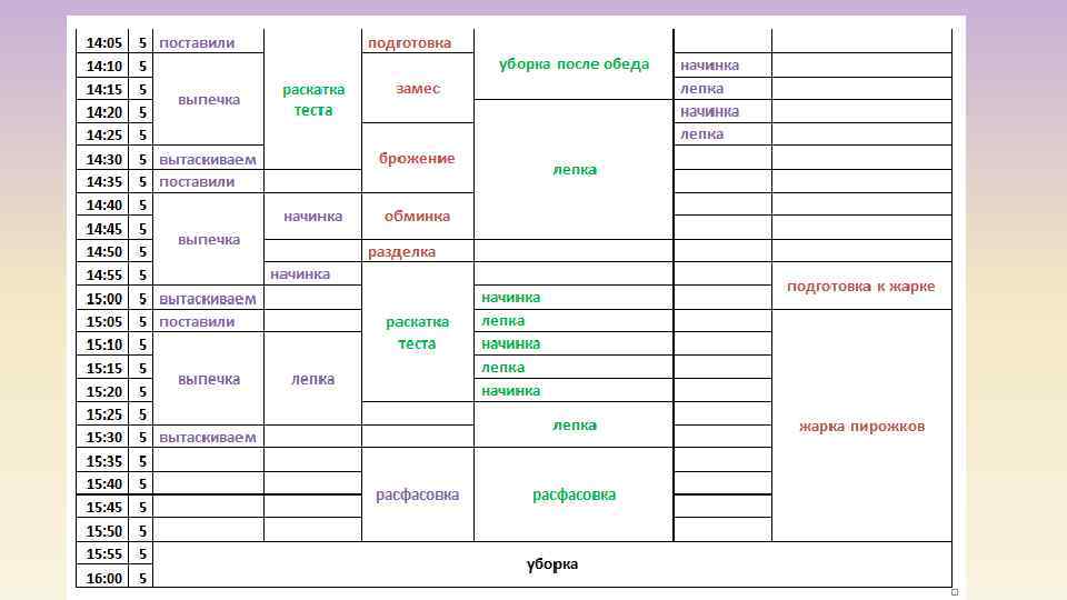 Параметры процесса • Время работы с 10: 00 до 16: 00 • Производительность раскаточной машины - 80 пирож/час • Тестомес – 8 кг / прием = 15 мин • Лепка – 5 минут – 10 пирожков (вдвоем 20 пирожков) • Начинка 5 минут - 20 пирожков • Выпечка в духовке 20 минут – 40 пирожков • Жарка на газе 5 минут (2 сковороды по 4) – 8 пирожков • Охлаждение и расфасовка • Производительность - 400 пирож/день