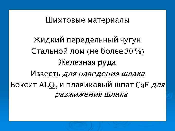 плавка на шихте из легированных отходов Шихта – скрап (отходы машиностроительных заводов) + чугун окалина и железная руда - для науглероживания, для окисления примесей Флюс - известняк Скрап характеризуется низким, по сравнению с выплавляемой сталью, содержанием Р, Mn и Si плавка идет без окисления примесей. Загрузка шихты Расплавление шихты Удаление S Науглераживание Получение заданного химсостава Диффузионное раскисление