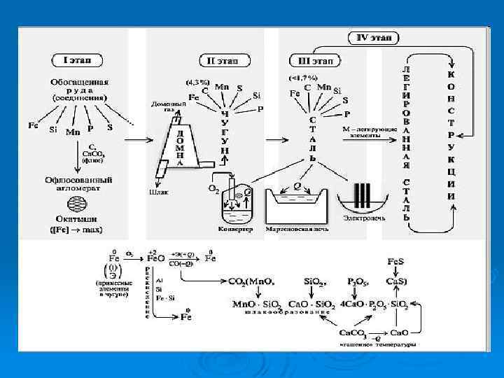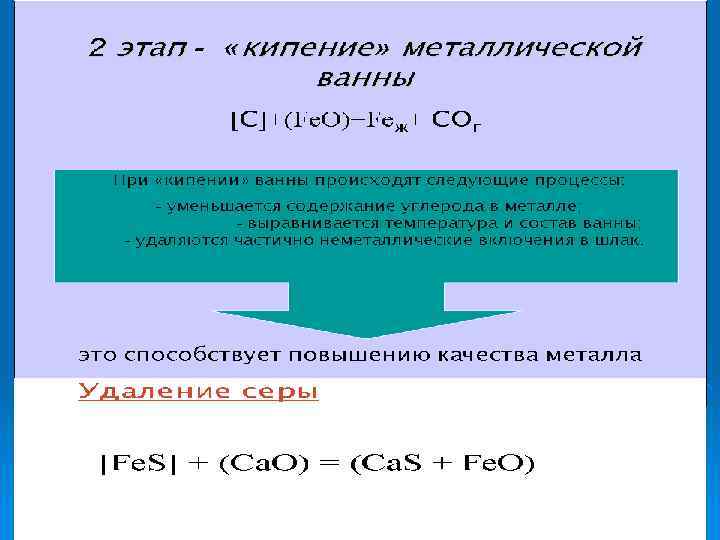 Этапы выплавки стали 1 этап - расплавление шихты и нагрев ванны жидкого металла Удаление фосфора 2[P] + 5 (Fe. O) + 4 (Ca. O) = (4 Ca. O. P 2 O 5) + 5 [Fe]