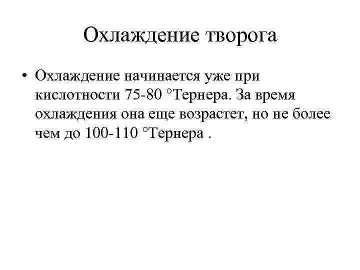 Охлаждение творога • Охлаждение начинается уже при кислотности 75 80 °Тернера. За время охлаждения она еще возрастет, но не более чем до 100 110 °Тернера.