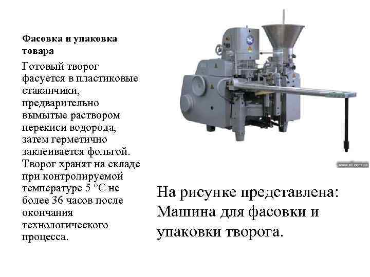 Фасовка и упаковка товара Готовый творог фасуется в пластиковые стаканчики, предварительно вымытые раствором перекиси водорода, затем герметично заклеивается фольгой. Творог хранят на складе при контролируемой температуре 5 °С не более 36 часов после окончания технологического процесса. На рисунке представлена: Машина для фасовки и упаковки творога.