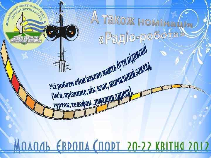 Інтернет-журналістика та ІТ До оргкомітету подається інформаційний ресурс (блог, сайт, живий журнал, форум тощо) згідно з тематикою фестивалю. Інформаційний ресурс може бути зроблений: на готовому майданчику (ЖЖ, twitter, bloger, facebook, blox. ua, worldpress, «БОТИНОК» тощо) або розроблений самостійно в програмі css та html. Роботи оцінюватимуться за такими критеріями: Чітка відповідність тематиці фестивалю; Зручність використання; Структурованість (рубрики, підрубрики); Координатор: Тепляков Іван Інформаційне наповнення; Швидкість завантаження; Дизайн, оформлення. КАТЕГОРИЧНО заборонено використання неадаптованих до Інтернету фотографій (розподільна здатність не більше 72 dpi).