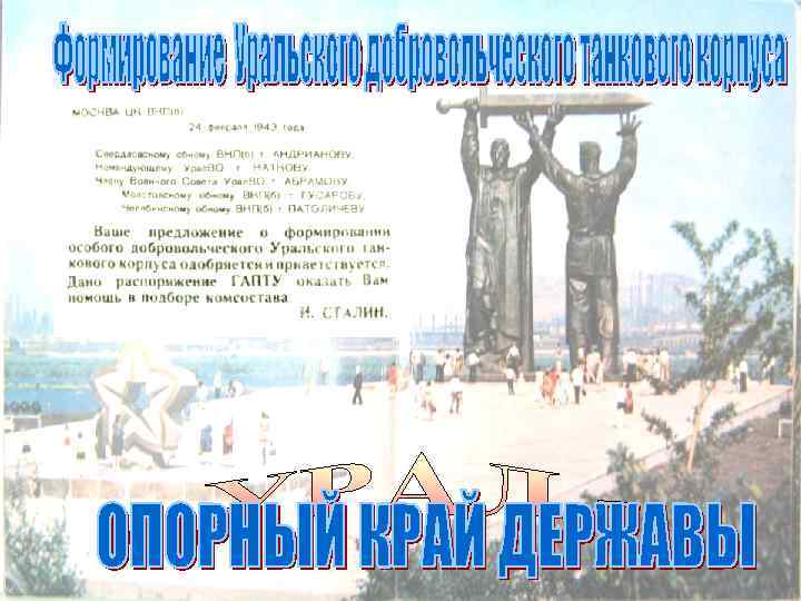 1943, февраль – началось формирование частей и подразделений Уральского добровольческого танкового корпуса. Поступило более 100000 заявлений от добровольцев. Зачислено 9000 человек 1943, февраль-май – на Урале сформирован из добровольцев и вооружён на средства жителей края 30 -ый танковый корпус 1943, октябрь – Уральскому добровольческому танковому корпусу присвоено звание гвардейского