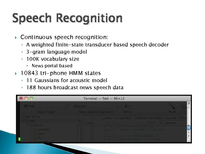 Speech Recognition Continuous speech recognition: ◦ A weighted finite-state transducer based speech decoder ◦ 3 -gram language model ◦ 100 K vocabulary size News portal based 10843 tri-phone HMM states ◦ 11 Gaussians for acoustic model ◦ 188 hours broadcast news speech data