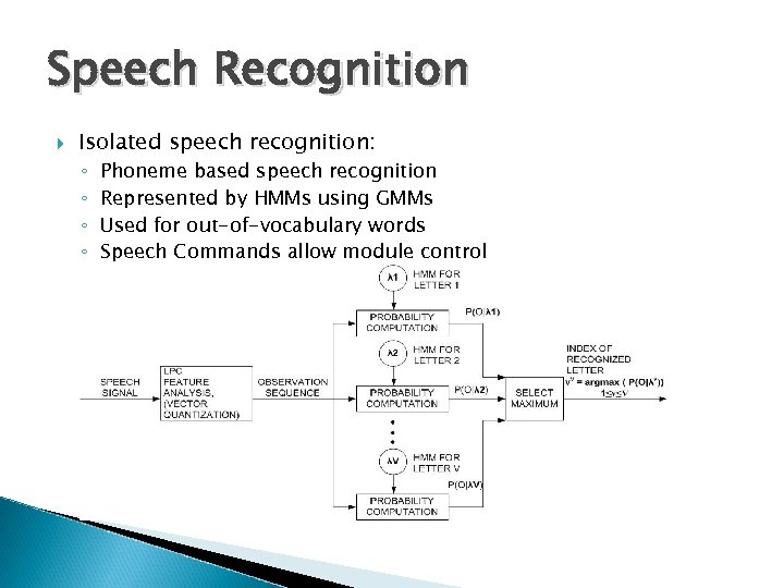 Speech Recognition Isolated speech recognition: ◦ ◦ Phoneme based speech recognition Represented by HMMs using GMMs Used for out-of-vocabulary words Speech Commands allow module control