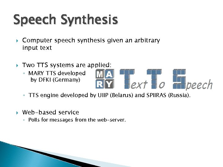 Speech Synthesis Computer speech synthesis given an arbitrary input text Two TTS systems are applied: ◦ MARY TTS developed by DFKI (Germany) ◦ TTS engine developed by UIIP (Belarus) and SPIIRAS (Russia). Web-based service ◦ Polls for messages from the web-server.