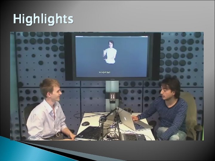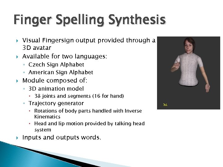 Finger Spelling Synthesis Visual Fingersign output provided through a 3 D avatar Available for two languages: ◦ Czech Sign Alphabet ◦ American Sign Alphabet Module composed of: ◦ 3 D animation model 38 joints and segments (16 for hand) ◦ Trajectory generator Rotations of body parts handled with Inverse Kinematics Head and lip motion provided by talking head system Inputs and outputs words.