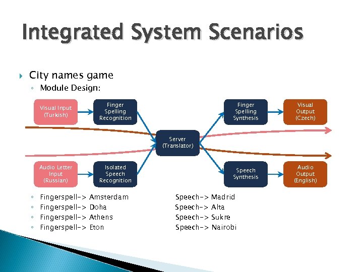 Integrated System Scenarios City names game ◦ Module Design: Visual Input (Turkish) Finger Spelling Recognition Finger Spelling Synthesis Visual Output (Czech) Speech Synthesis Audio Output (English) Server (Translator) Audio Letter Input (Russian) ◦ ◦ Fingerspell-> Isolated Speech Recognition Amsterdam Doha Athens Eton Speech-> Madrid Speech-> Alta Speech-> Sukre Speech-> Nairobi