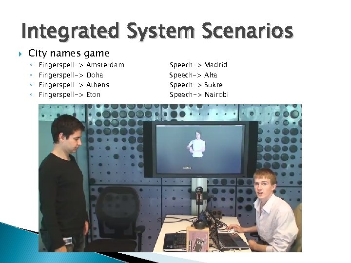 Integrated System Scenarios City names game ◦ ◦ Fingerspell-> Amsterdam Doha Athens Eton Speech-> Madrid Speech-> Alta Speech-> Sukre Speech-> Nairobi
