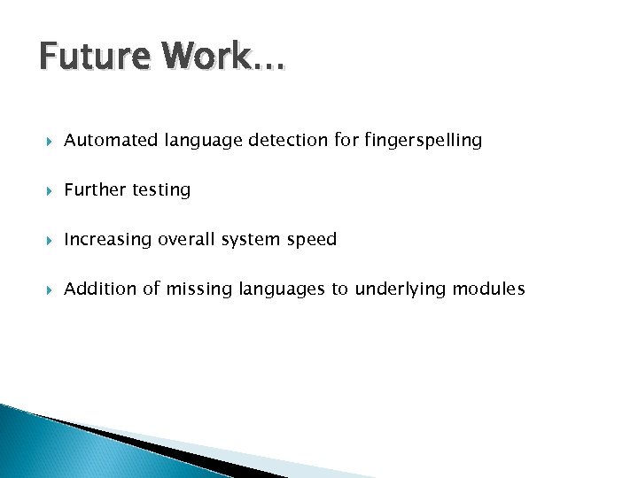 Future Work. . . Automated language detection for fingerspelling Further testing Increasing overall system speed Addition of missing languages to underlying modules
