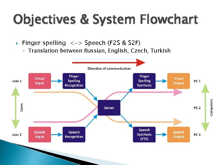 Objectives & System Flowchart Finger spelling <-> Speech (F 2 S & S 2 F) ◦ Translation between Russian, English, Czech, Turkish