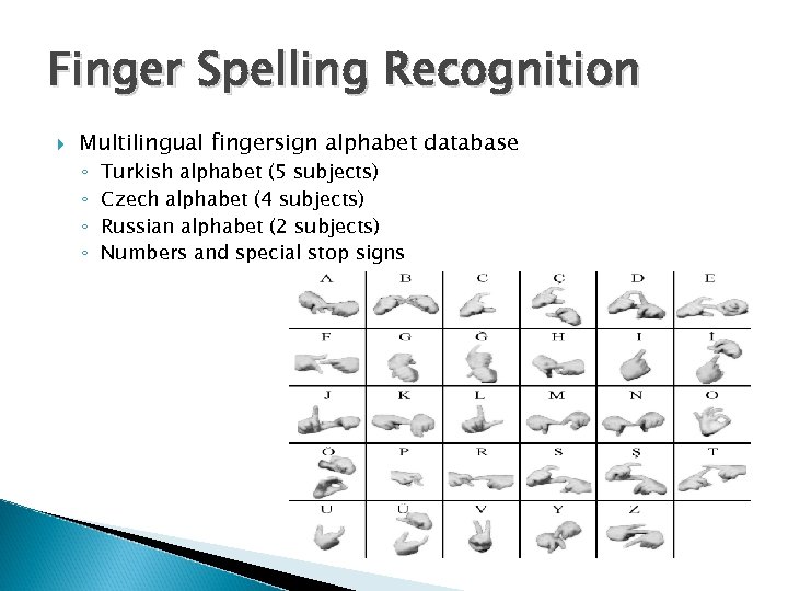 Finger Spelling Recognition Multilingual fingersign alphabet database ◦ ◦ Turkish alphabet (5 subjects) Czech alphabet (4 subjects) Russian alphabet (2 subjects) Numbers and special stop signs
