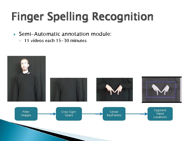 Finger Spelling Recognition Semi-Automatic annotation module: ◦ 11 videos each 15 -30 minutes Filter Images Crop Sign. Space Select Keyframes Segment Hand Locations