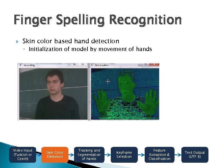 Finger Spelling Recognition Skin color based hand detection ◦ Initialization of model by movement of hands Video Input (Turkish or Czech) Skin Color Detection Tracking and Segmentation of hands Keyframe Selection Feature Extraction & Classification Text Output (UTF 8)