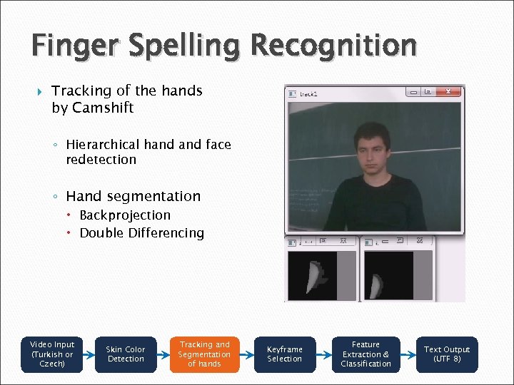 Finger Spelling Recognition Tracking of the hands by Camshift ◦ Hierarchical hand face redetection ◦ Hand segmentation Backprojection Double Differencing Video Input (Turkish or Czech) Skin Color Detection Tracking and Segmentation of hands Keyframe Selection Feature Extraction & Classification Text Output (UTF 8)
