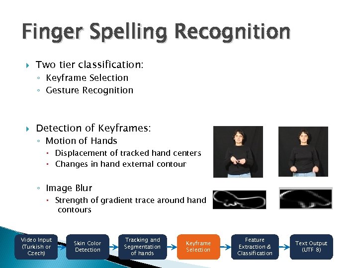 Finger Spelling Recognition Two tier classification: ◦ Keyframe Selection ◦ Gesture Recognition Detection of Keyframes: ◦ Motion of Hands Displacement of tracked hand centers Changes in hand external contour ◦ Image Blur Strength of gradient trace around hand contours Video Input (Turkish or Czech) Skin Color Detection Tracking and Segmentation of hands Keyframe Selection Feature Extraction & Classification Text Output (UTF 8)