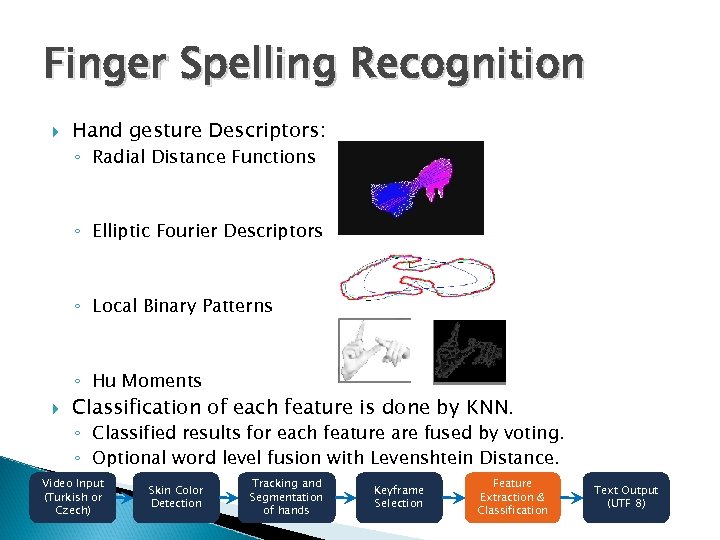 Finger Spelling Recognition Hand gesture Descriptors: ◦ Radial Distance Functions ◦ Elliptic Fourier Descriptors ◦ Local Binary Patterns ◦ Hu Moments Classification of each feature is done by KNN. ◦ Classified results for each feature are fused by voting. ◦ Optional word level fusion with Levenshtein Distance. Video Input (Turkish or Czech) Skin Color Detection Tracking and Segmentation of hands Keyframe Selection Feature Extraction & Classification Text Output (UTF 8)