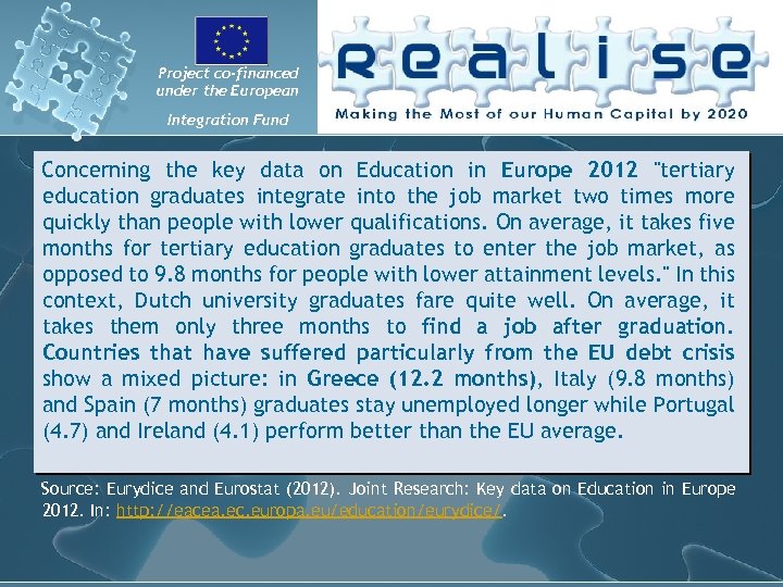 Project co-financed under the European Integration Fund Concerning the key data on Education in Europe 2012 "tertiary education graduates integrate into the job market two times more quickly than people with lower qualifications. On average, it takes five months for tertiary education graduates to enter the job market, as opposed to 9. 8 months for people with lower attainment levels. " In this context, Dutch university graduates fare quite well. On average, it takes them only three months to find a job after graduation. Countries that have suffered particularly from the EU debt crisis show a mixed picture: in Greece (12. 2 months), Italy (9. 8 months) and Spain (7 months) graduates stay unemployed longer while Portugal (4. 7) and Ireland (4. 1) perform better than the EU average. Source: Eurydice and Eurostat (2012). Joint Research: Key data on Education in Europe 2012. In: http: //eacea. ec. europa. eu/education/eurydice/.