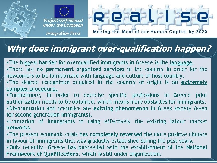 Project co-financed under the European Integration Fund Why does immigrant over-qualification happen? • Τhe biggest barrier for overqualified immigrants in Greece is the language. • There are no permanent organized services in the country in order for the newcomers to be familiarized with language and culture of host country. • The degree recognition acquired in the country of origin is an extremely complex procedure. • Furthermore, in order to exercise specific professions in Greece prior authorization needs to be obtained, which means more obstacles for immigrants. • Discrimination and prejudice are existing phenomenon in Greek society (even for second generation immigrants). • Limitation of immigrants in using effectively the existing labour market networks. • The present economic crisis has completely reversed the more positive climate in favour of immigrants that was gradually established during the past years. • Only recently, Greece has proceeded with the establishment of the National Framework of Qualifications, which is still under organization.
