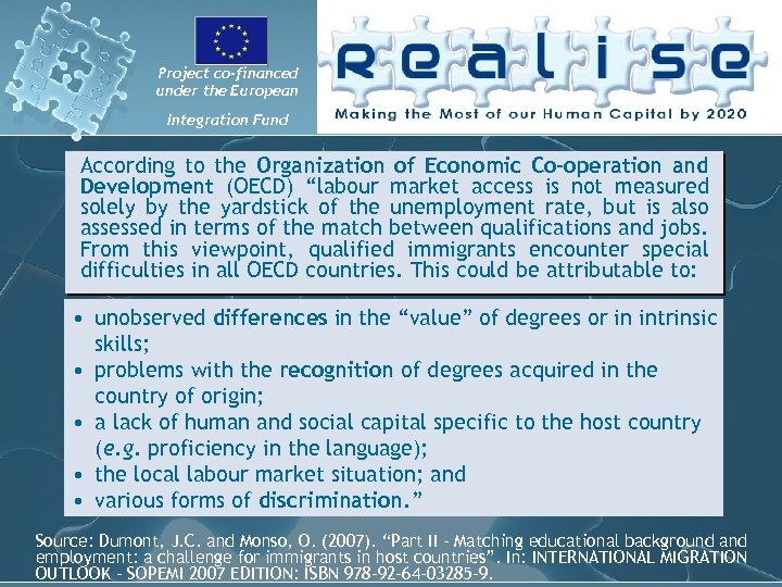 Project co-financed under the European Integration Fund According to the Organization of Economic Co-operation and Development (OECD) “labour market access is not measured solely by the yardstick of the unemployment rate, but is also assessed in terms of the match between qualifications and jobs. From this viewpoint, qualified immigrants encounter special difficulties in all OECD countries. This could be attributable to: • unobserved differences in the “value” of degrees or in intrinsic skills; • problems with the recognition of degrees acquired in the country of origin; • a lack of human and social capital specific to the host country (e. g. proficiency in the language); • the local labour market situation; and • various forms of discrimination. ” Source: Dumont, J. C. and Monso, O. (2007). “Part II - Matching educational background and employment: a challenge for immigrants in host countries”. In: INTERNATIONAL MIGRATION OUTLOOK - SOPEMI 2007 EDITION: ISBN 978 -92 -64 -03285 -9.