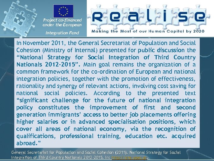 Project co-financed under the European Integration Fund In November 2011, the General Secretariat of Population and Social Cohesion (Ministry of Internal) presented for public discussion the “National Strategy for Social Integration of Third Country Nationals 2012 -2015”. Main goal remains the organization of a common framework for the co-ordination of European and national integration policies, together with the promotion of effectiveness, rationality and synergy of relevant actions, involving cost saving for national social policies. According to the presented text “significant challenge for the future of national integration policy constitutes the improvement of first and second generation immigrants’ access to better job placements offering higher salaries or in advanced specialisation positions, which cover all areas of national economy, via the recognition of qualifications, professional training, education etc. acquired abroad. ” General Secretariat for Population and Social Cohesion (2011). National Strategy for Social Integration of Third Country Nationals 2012 -2015. In: http: //ete. ypes. gr.