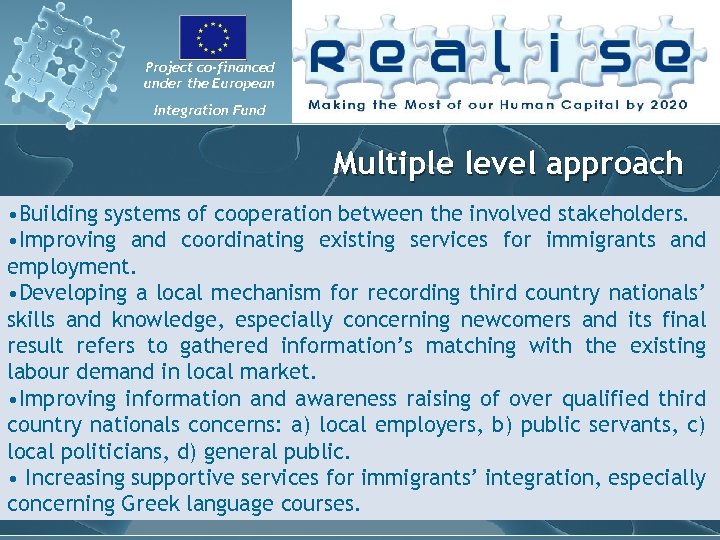 Project co-financed under the European Integration Fund Multiple level approach • Building systems of cooperation between the involved stakeholders. • Improving and coordinating existing services for immigrants and employment. • Developing a local mechanism for recording third country nationals’ skills and knowledge, especially concerning newcomers and its final result refers to gathered information’s matching with the existing labour demand in local market. • Improving information and awareness raising of over qualified third country nationals concerns: a) local employers, b) public servants, c) local politicians, d) general public. • Increasing supportive services for immigrants’ integration, especially concerning Greek language courses.