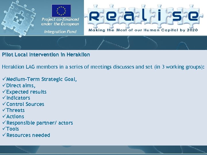 Project co-financed under the European Integration Fund Pilot Local Intervention in Heraklion LAG members in a series of meetings discusses and set (in 3 working groups): üMedium-Term Strategic Goal, üDirect aims, üExpected results üIndicators üControl Sources üThreats üActions üResponsible partner/ actors üTools üResources needed