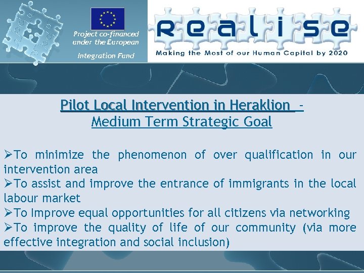 Project co-financed under the European Integration Fund Pilot Local Intervention in Heraklion Medium Term Strategic Goal ØTo minimize the phenomenon of over qualification in our intervention area ØTo assist and improve the entrance of immigrants in the local labour market ØTo Improve equal opportunities for all citizens via networking ØTo improve the quality of life of our community (via more effective integration and social inclusion)