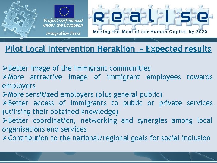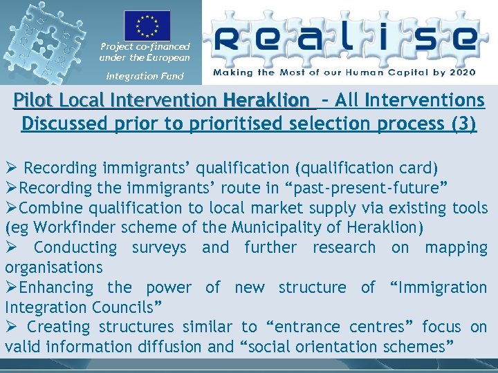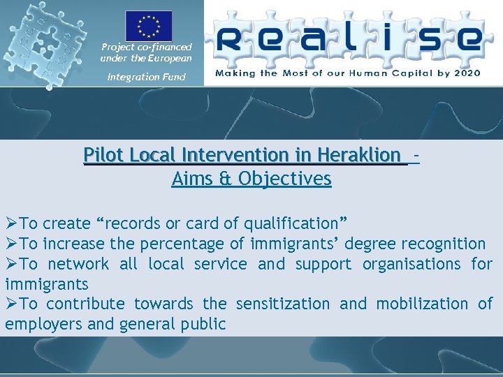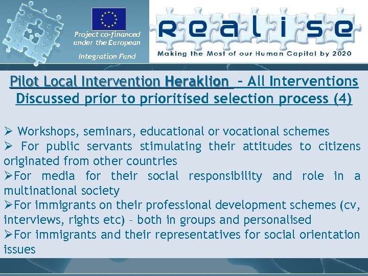 Project co-financed under the European Integration Fund Local key Stakeholders Panels (PLS) have a vital role within the planning & implementation of actions in favour of overqualified third country nationals in the locality under study. In the framework of REALISE Project, PLS has specific purpose: • To better conceive policy and actions, by benefiting from the insight of those affected by and most concerned with such policies and actions. • To obtain their support (‘buy in’) for the policies and actions that will be pursued. • To obtain more support outside of the PLS, by advocating in the community. The idea is they become “multipliers of the message”, by campaigning for Realise Project in the area of Heraklion (formally or informally), raising awareness and disseminating. • To participate in undertaking the local diagnosis of severity and cause of over qualification, being the key info providers. • To participate in developing pilot local interventions because these interventions will be designed by and negotiated with the PLS. • To participate in developing long-term strategies to scale-up pilot interventions to policy level because PLS members have the power to influence policy.